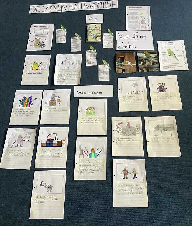 Eine 2. Klasse hat sich mit Krabbeltieren in ihrem “Forschungszentrum für kleine Entdeckerinnen und Entdecker" beschäftigt: Im Fokus standen heimischen Nützlinge - besonders Libellen, Ameisen, Marienkäfer, Schmetterlinge und Spinnen. Ausgerüstet mit Becherlupen ging es nach draußen, um die Tiere aus nächster Nähe in ihrem natürlichen Lebensraum zu beobachten. Eine Parallelklasse hat sich in einem abwechslungsreichen Literaturprojekt mit der “Sockensuchmaschine” beschäftigt, eine andere machte sich auf die Suche nach dem Glück, sammelte Glücksmomente in einem Glas und bemalte Glückssteine zum Verschenken. Wieder eine andere Klasse hat sich mit dem Aufbau von Instrumenten wie einer Geige auseinandergesetzt und anschließend eine Orgel besucht.
